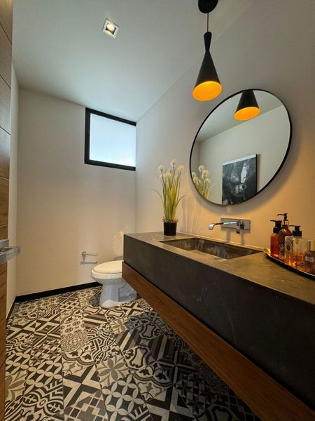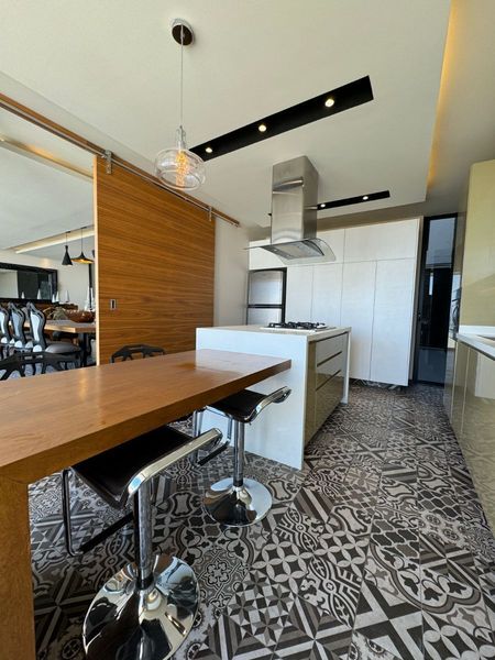Sala, comedor, 1/2 baño, cocina integral equipada, estudio, cuarto de lavado, patio de servicio, cuarto de servicio y cochera techada para 2 autos.